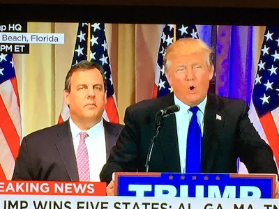 Yeah, that's pretty much how the Rude Pundit felt watching Gov. Chris Christie standing behind Donald Trump while Trump gave another of his stream of (barely) consciousness self-congratulatory speeches after winning a bunch of the primaries last night on Super Tuesday (which is a dumb goddamn name for anything that adults are supposed to be involved in). Whatever Christie was thinking, whether it was "I might have helped burn the country to the ground" or "I hope he doesn't talk too long so I can get more hot wings," being backseat bitch to the alpha dog of assholery is everything he deserves.